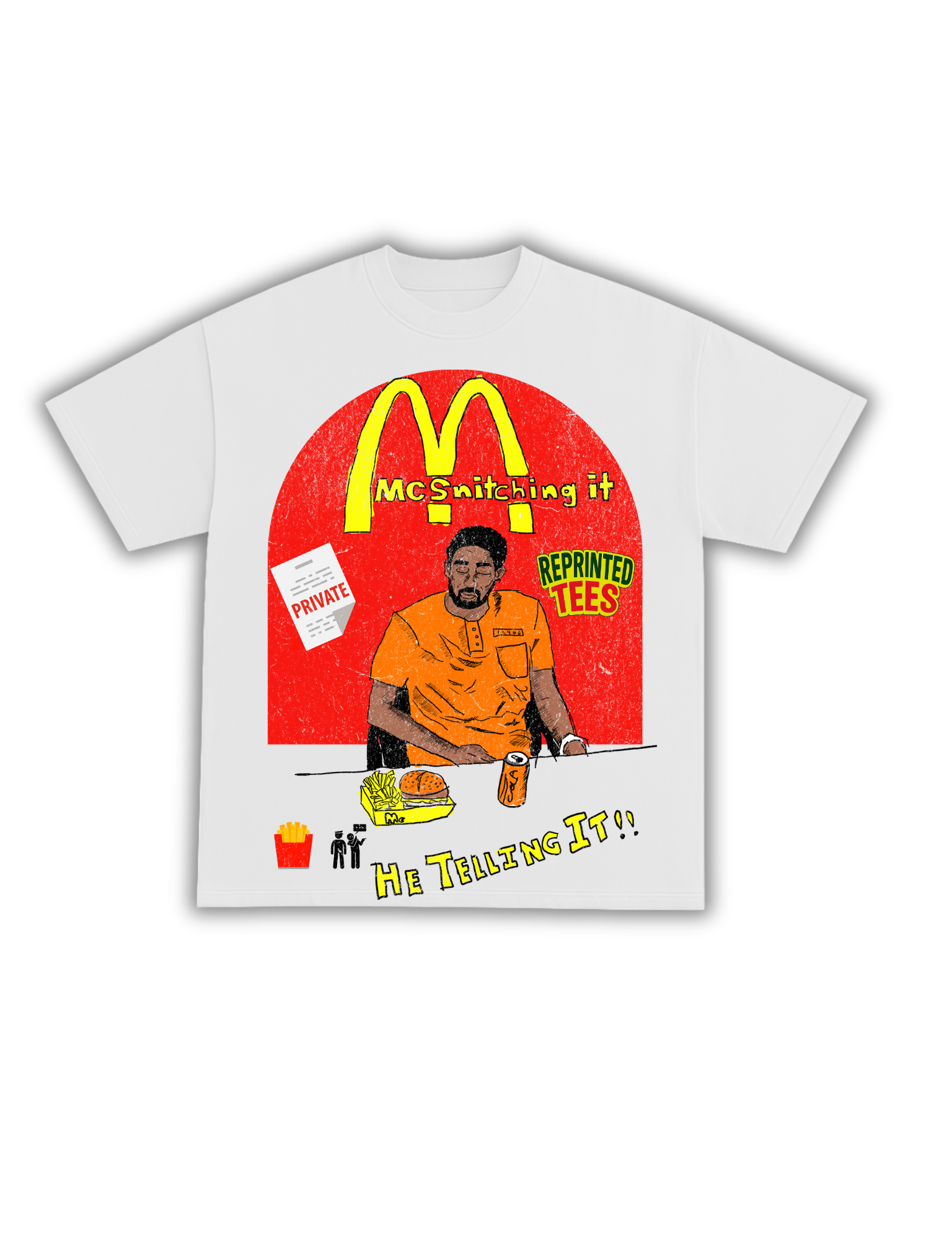 🔥 McSnitching Tee by Reprinted Tees – Bold Red & Golden Arches Fade. Heavyweight, garment-dyed, and packed with streetwise parody energy. 🍔 A tongue-in-cheek classic that flips fast food culture into a statement on the code of the streets. Rock it loud, rock it proud—because real ones know, loyalty’s the only meal worth serving.
